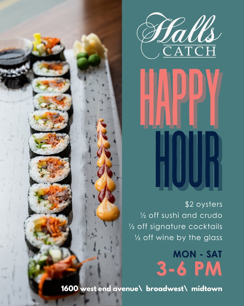 Enjoy $2 oysters, half-off sushi and crudo, half-off signature cocktails, and half-off wine by the glass.