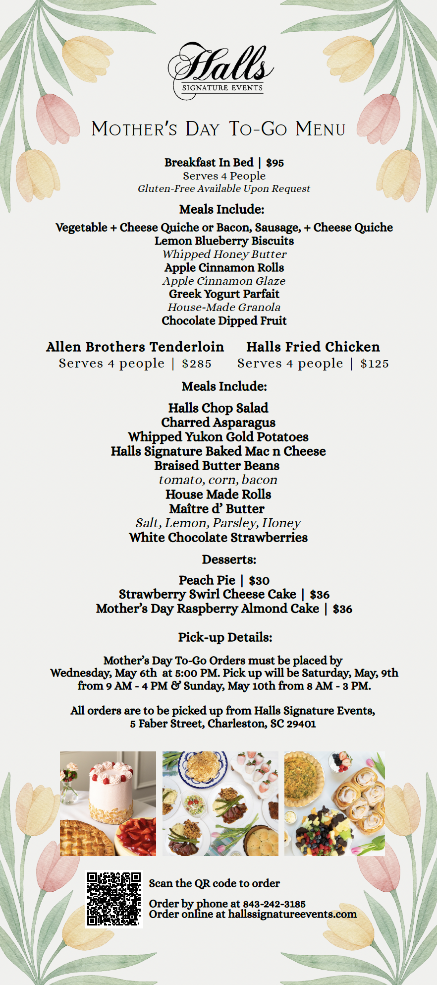 All orders are to be picked up from Halls Signature Events, 5 Faber Street, Charleston, SC 29401