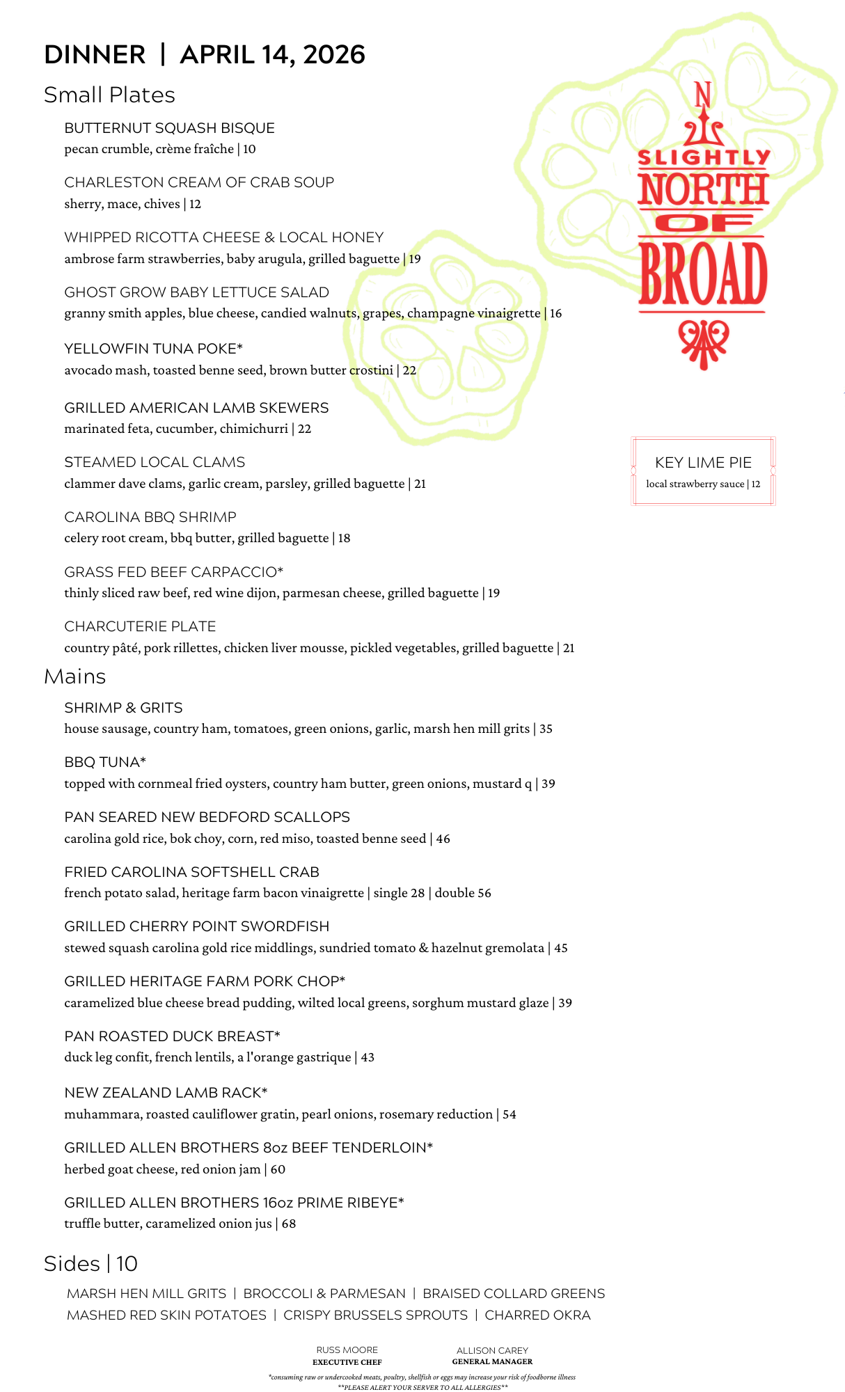 SNOB Dinner Menu - April 14, 2026